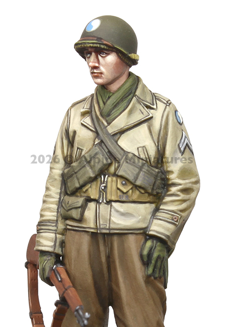 M1941フィールドジャケットを着用、ウールマフラーを巻き、M1ガーランド小銃を右手に持って立つ伍長をモデル化します。カートリッジベルトに加えて両肩にたすき掛けしたM1バンダリア、水筒、折り畳み式スコップなどの装備品も精密に再現します。ヘルメットを被ったヘッドは2個入で、偽装用ネット付/なしの選択式です。