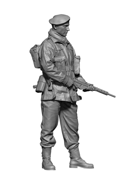 ベレー帽を被り、空挺部隊用のデニソン・スモックを着用、フェイスベールを首に巻き、両手でステンMk.V短機関銃を構えて立つ姿をモデル化しています。胸のアンモポーチ、背中のハバーパック、水筒、エントレンチングツールなどの装備品も精密に再現しています。