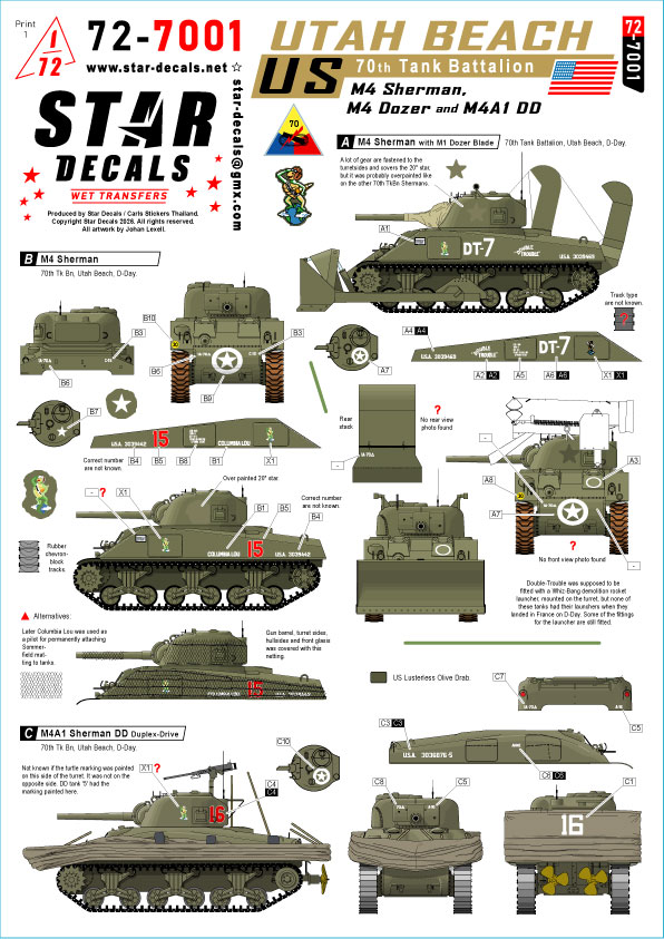 STAR DECALS[SD72-7001]1/72 WWII アメリカ ユタビーチ第70戦車大隊のM4シャーマン戦車 M4/M4ドーザー/M4A1 DD [ご注文締切日 5月1日(金)6月入荷予定]