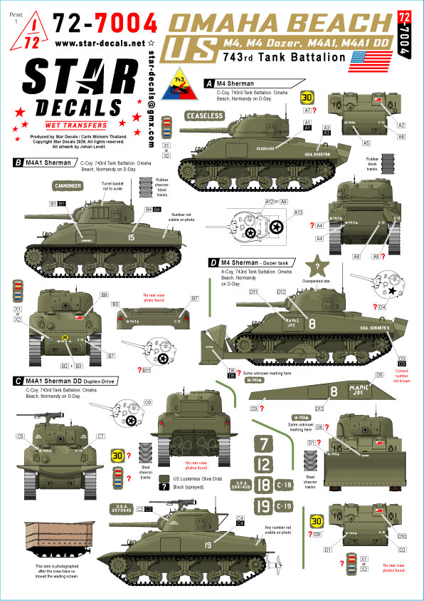 STAR DECALS[SD72-7004]1/72 WWII アメリカ オマハビーチ第743戦車大隊のM4シャーマン戦車 M4/M4ドーザー/M4A1/M4A1 DD