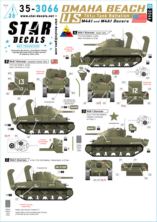 STAR DECALS[SD35-3066]1/35 WWII アメリカ オマハビーチ第741戦車大隊のM4シャーマン戦車 M4A1/M4A1ドーザー