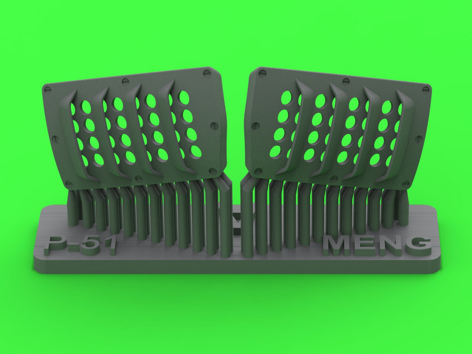 第二次大戦アメリカ軍のP-51ムスタング戦闘機の機首下部左右のキャブレターエアフィルターカバーパネルを再現するディテールパーツです。モンモデル製キットに対応します。