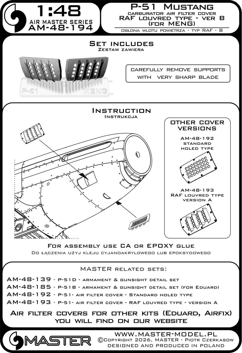 MASTER[AM-48-194]1/48 WWII アメリカ P-51ムスタング キャブレターエアフィルターカバー RAFルーバータイプ バージョンB(モンモデル用)