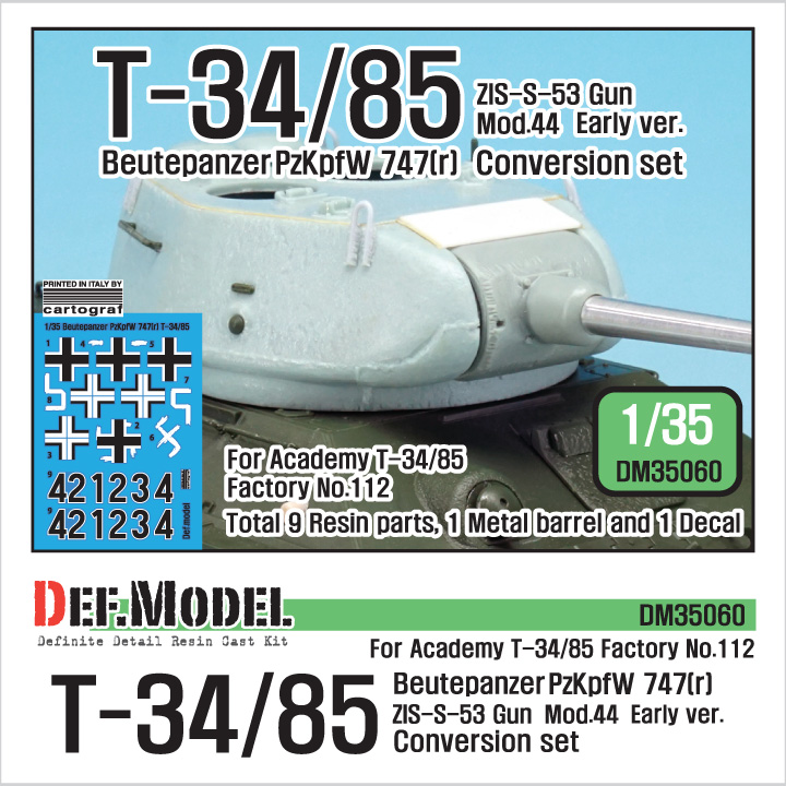 アカデミーの112工場製 T-34/85の砲塔を1944年初期型に差し替えるキットです。金属砲身付き。ドイツ軍捕獲バージョンにするためのデカール付き。デカールはカルトグラフ製です。