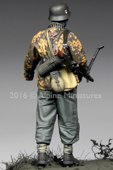 ポトー近郊で撮影された有名な記録写真をモチーフにしたフィギュアです。上半身はジャケットの上に迷彩スモック、下半身にはスモックの上に防寒服のズボンを重ね着しています。肩からMG42を掛け、右手にはブローニングハイパワー(P640(b))、胸元には白兵戦用ナイフ、ベルトに挿したスコップと、まさに記録写真から抜け出てきたような格好です。記録写真と同じカバー無しへルメットの他、カバー付きヘルメットを選択できるスペアヘッド付きです。