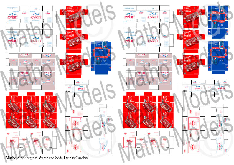 世界的に流通している某有名ブランドのミネラルウォーターと清涼飲料水の紙箱セットです。ダイオラマの脇役として、車両の積荷として非常に便利です。