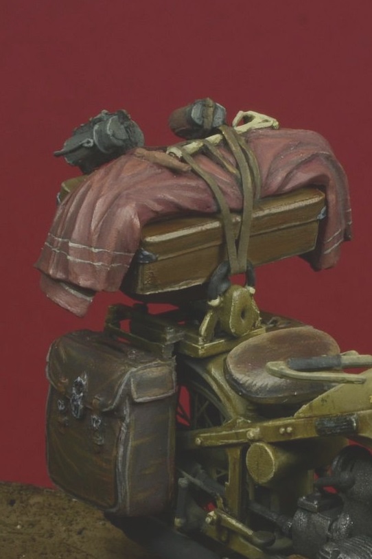 ドイツのモーターバイクに乗せるアクセサリーですが、私物のトランクが載っかっていたりとユニークなアクセサリーセットで、将校が私物の一切合財を積んで移動中、というような趣です。(バイクは付属しません)