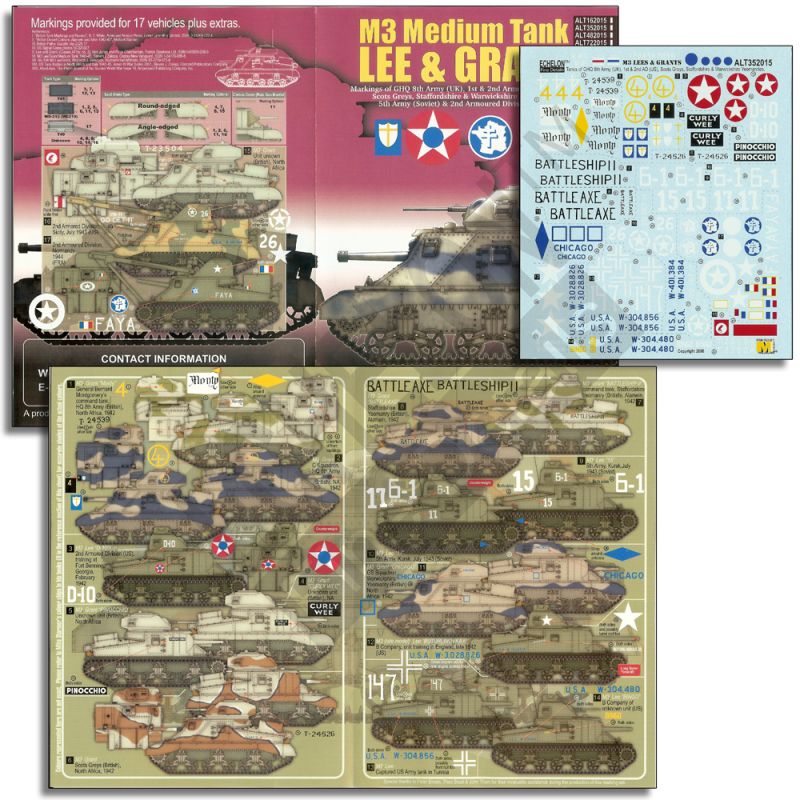 多種多様なリーとグラントのマーキングが楽しめる内容です。グラントが一番活躍した英第8軍の車両、アメリカ陸軍のリー、レンドリース供与されたソビエト軍所属車、そしてドイツ軍捕獲車両等々。合計12種を製作可能。どれを選ぼうか目移りするカラフルなセットです。