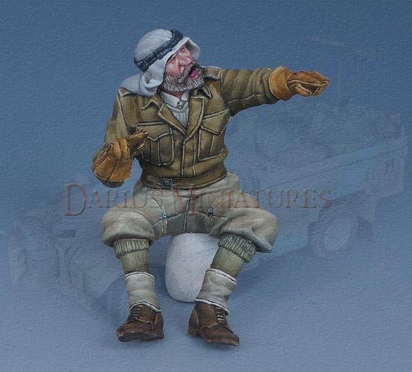クーフィーヤと呼ばれる、アラブでお馴染みの頭巾を被ったシボレードライバーです。砂漠の日光で過熱した車体に触っても大丈夫なように分厚い革手袋を装着しています。タミヤのシボレーの運転席にぴったり収まるよう造形してありますが、多少の調整でSASジープにも載せられます。