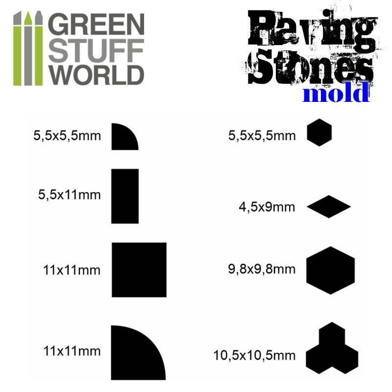 8種類の舗石を簡単に作る事ができるシリコン型です。レジン、各種粘土やエポパテを使用可能で、240度までの耐熱シリコンですのでスカルピーなどを使うことも可能です。また、食材を詰めることも考えて設計されています。お菓子の素材を詰めてケーキの凝った飾り付けの材料にしても構いません。