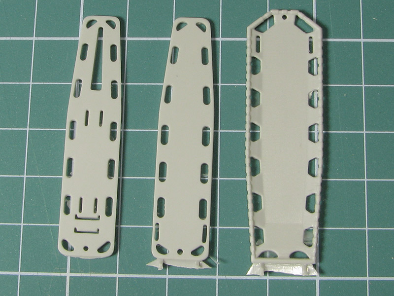 一般型と違い軍用のグリーン系に仕様変更された脊椎ボードを再現しました。即席地雷等で負傷兵が絶えない米軍の哨戒車両に車載されているのを目にする事が有ります。レジン製
