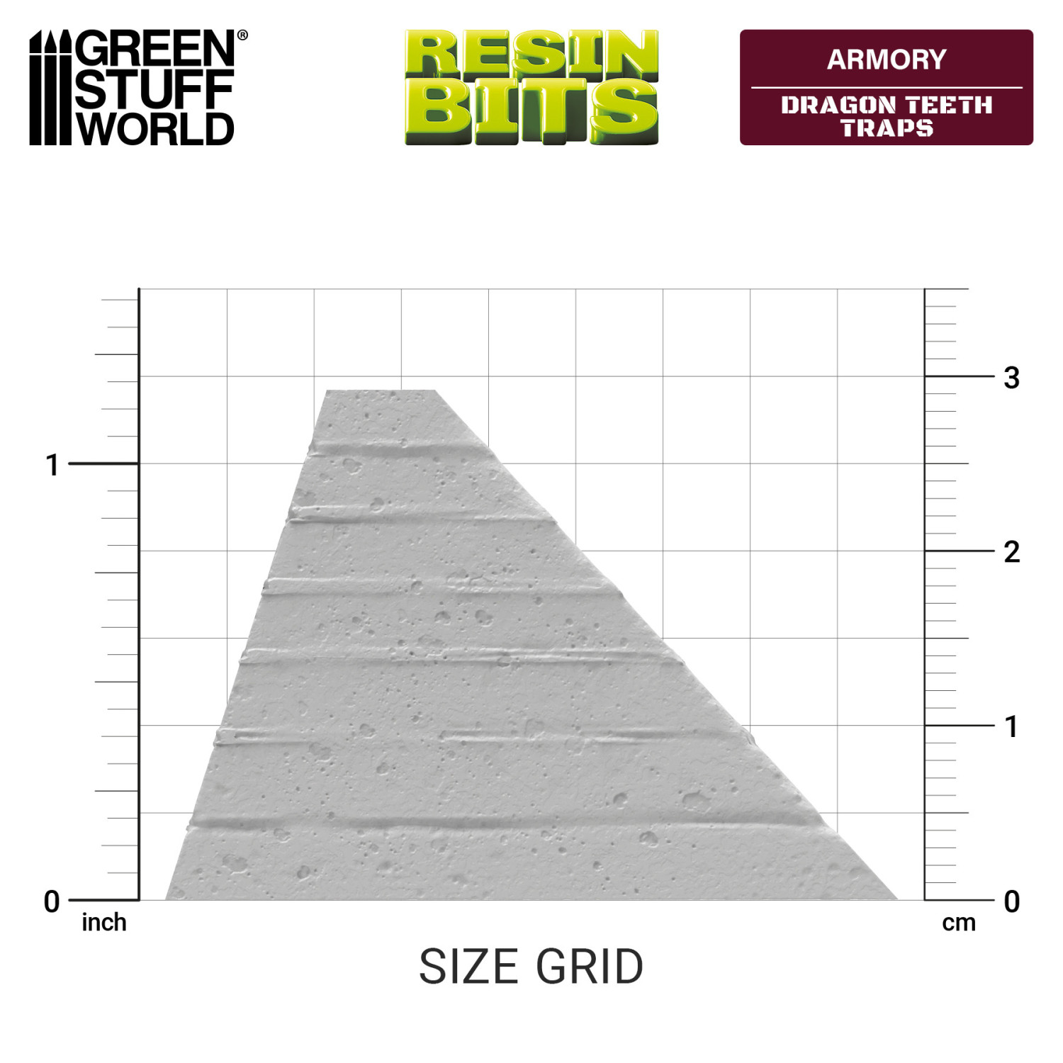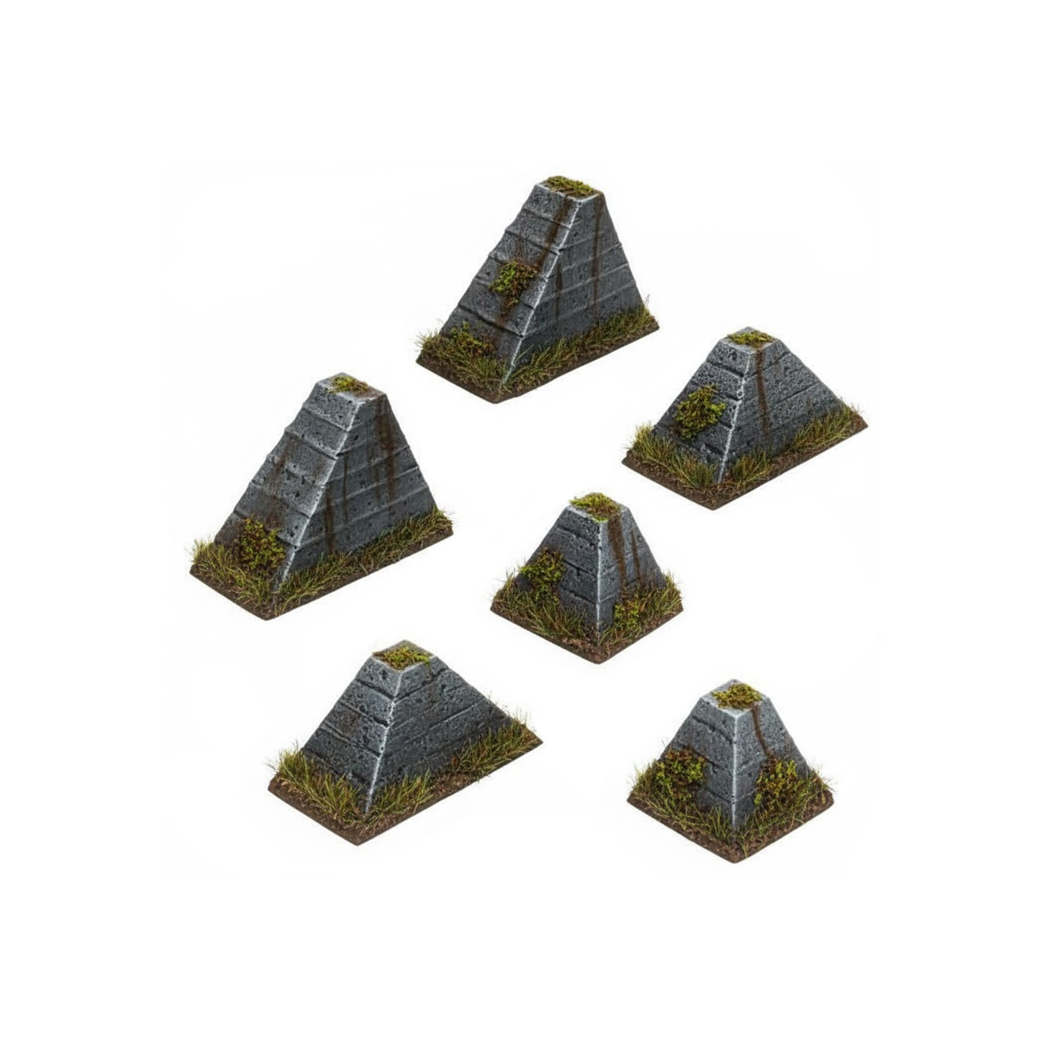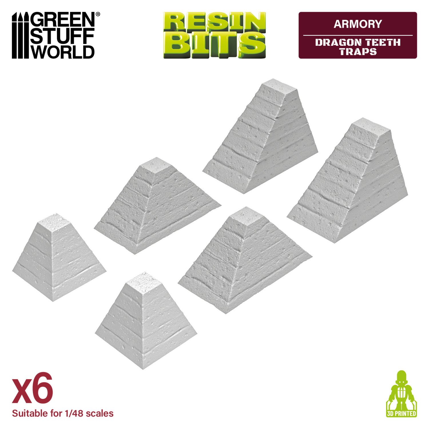 ジオラマやウォーゲームの戦場にリアルな防御障害物を追加する、3Dプリントのレジン製ドラゴンティース(戦車用障害物)です。