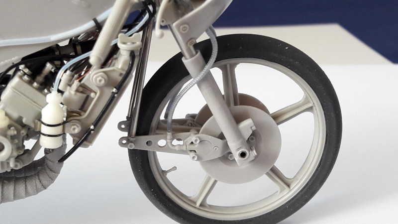 ガレリ社は1919年にエンジニアのアダベルト・ガレリ氏が設立したオートバイメーカーで第二次大戦前から積極的にレースへ参戦し多数のタイトルを手中に収めました。戦後の混乱を経て1980年よりロードレースに復帰、125ccクラスに於いて1982年から87年までの6年間連続してチャンピオンマシンを送り出したのです。この80年代のガレリ黄金期を支えた傑作マシン「ガレリ125cc」を1/12ケールで精密に再現しました。レジンを中心に配線用ビニールチューブ、エッチングパーツ、金属パーツ、ゴム製タイヤなど部品総数は450点を超えるキットですが部品精度は高く、所有する喜びと組み立てる楽しみの両方を満たしてくれる稀有なキットです。