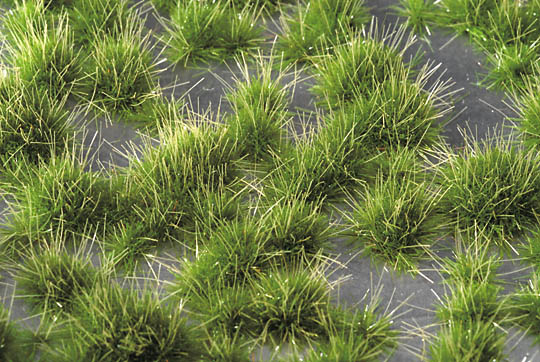 草むらが株単位でシートに貼り付いています。草をピンセットでシートから剥がし、根元にボンドを塗って地面に付けていきます。最もポピュラーで場所を選ばないタイプです。背が高いものと低いものの2パターンが用意されていますが、背が高い草の先を切って、自分で低く加工するのも一つの手です。ミニネイチャーのみを用いる場合、大量に並べて草むらを演出すると実感的に仕上がります。一株一株点在させたい場合は、パウダーやスタティックグラスなどを併用すると雰囲気が出ることでしょう。