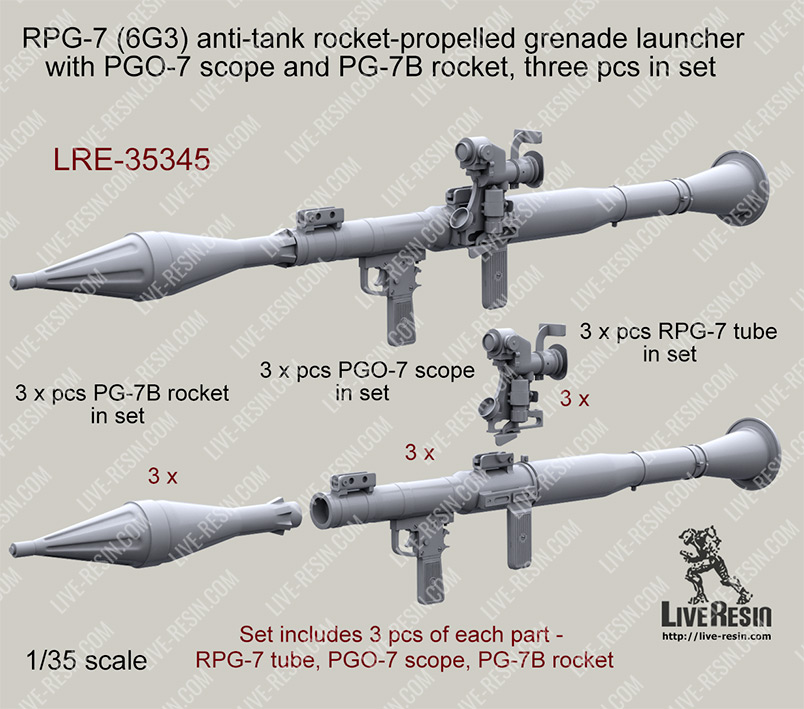 Live Resin[LRM35345]1/35 RPG-7 (6G3) anti-tank rocket-propelled grenade launcher with PGO-7 scope and PG-7B rocket, 3 pcs in set