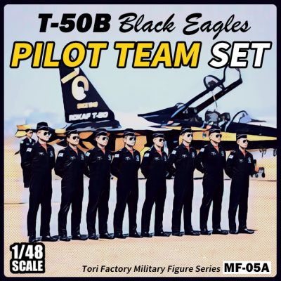 朝鮮戦争終了直後の1953年に停戦記念としてアクロバット飛行が計画され臨時に結成された「臨時飛行隊」が現在の第239特殊飛行大隊通称「ブラックイーグルス」の起源とされています。その後は編成と解散を繰り返して来ましたが2009年に国産のT-50練習機を持って正式編成されました。今回モデル化したこのフィギュアセットはブラックイーグルスのパイロットがウォークダウンと呼ばれる機体搭乗前の整列を再現したものです。アカデミーから1/48のT-50練習機が出ていますのでそれに合わせてこのウォークダウンをジオラマとして仕上げて下さい。