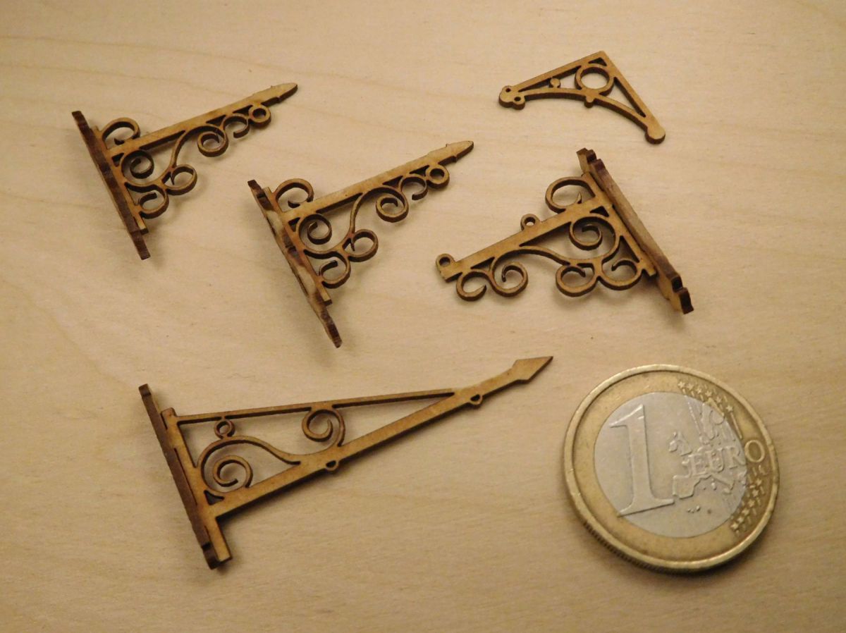 建物の角や玄関などに装飾を兼ねた鉄製装飾ブラケット(支柱)を再現したセットです。看板を下げる基部も再現されているので店舗の入口に掲げる事も出来ます。またサイズも大中小と用意されています。MDF製なので表面をサフェーサー等で整え塗装する事で鉄の様な仕上がりに出来ます。薄手のMDF(工業用ファィバーボード)をレーザー加工で切り出したものなので断面は非常に綺麗にです。接着には木工用ボンドか木工用瞬間接着剤をご利用下さい。