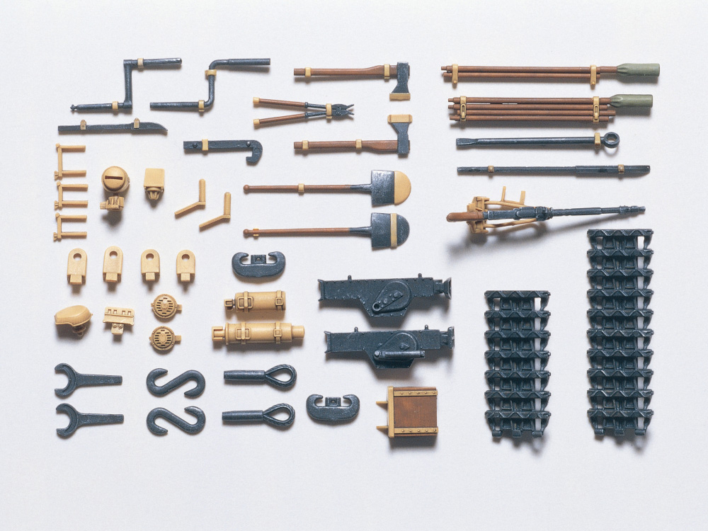 第二次大戦中のドイツ軍IV号戦車に使える車外装備品をセットしました。フェンダー上に装備される工具を中心に、18トンと20トンジャッキ、バールやワイヤーカッター、斧やスコップなどからキャタピラのテンション調整工具や砲身のクリーニングロッドなど戦車ならではの装備品も用意。IV号戦車だけでなく他のドイツ軍戦車や車輛にも幅広く応用できます。
