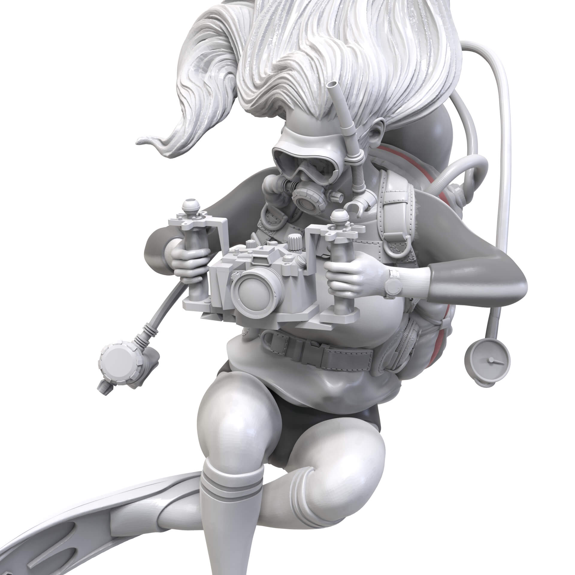 防水加工を施したデジタル一眼レフを構え水中での決定的な一瞬を捉えようするカメラガールのプリンチェスを1/20スケールフィギュアとしてキット化しました。暖かい海域で着用するハイカットスプリングと呼ばれるウェットスーツに身を包んだダイバーガールが再現されています。頭部の水中ゴーグルは別パーツなので瞳の部分までしっかりと塗装で仕上る事が出来ます。