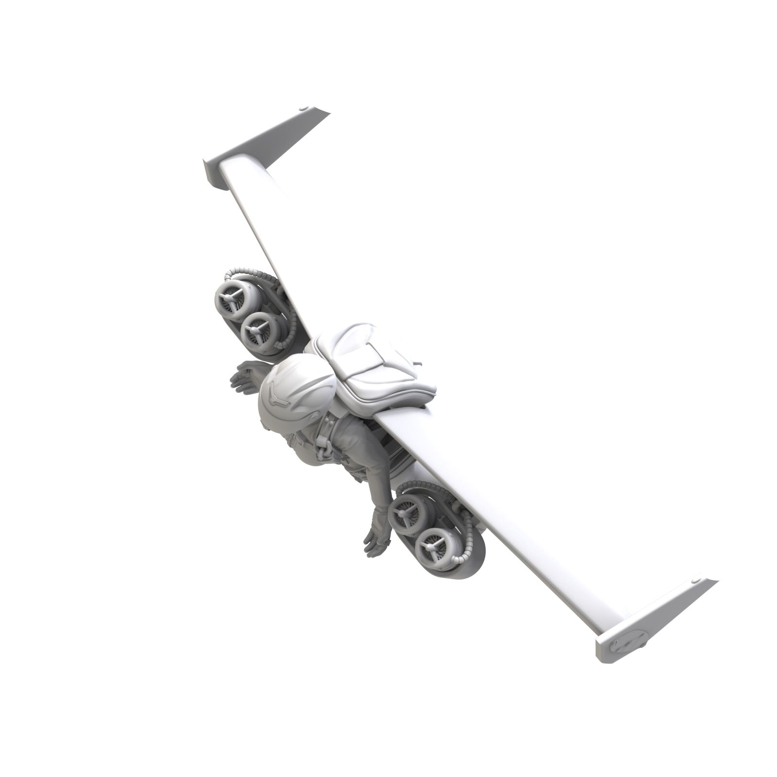 カーボンファイバー製の強靭な翼に高出力のジェットエンジンを搭載して自力で飛行出来るジェットウィングを身に着けたジェットガール「クインジェット」を1/24スケールで再現しました。ジェットウィングを操るクインジェットのデイテールも素晴らしいですが、ジェットウィング自体の造り、補助翼やジェットエンジンのディテールもかなり拘って再現しています。1/24スケールなので全体のボリューム感はかなり有ると言えます。高品質レジン製 ※本製品は未塗装未組立です。