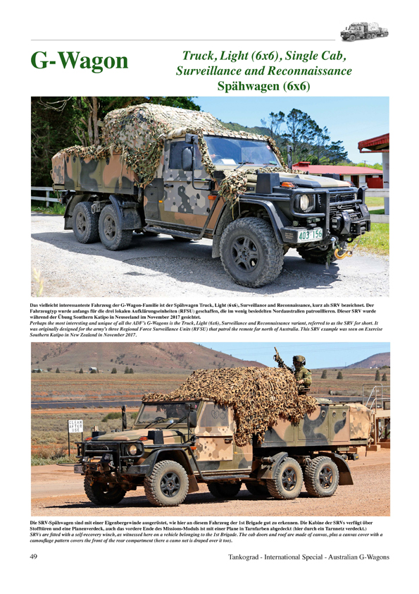 オーストラリア国防軍はそれまで汎用型軍用車として運用していたランドローバーと専用の貨載牽引トレーラーが老朽化した事でこれら軍用車の大規模な更新が必要となり2000年頃より後継車の規定とその購入計画が行われました。継続車の規定に応え入札により選定されたのはメルセデス・ベンツのGワゴンでした。最終的に結ばれた契約ではGワゴンは4×4と6×6の2種類で構成されて各業務をカバーし特に後者の6×6シャーシはオーストラリア国防軍の為にメルセデス・ベンツが特別に開発したものでした。本刊では豪国防軍で本格的に運用開始した4×4と6×6シャーシのGワゴンを多数の写真とイラストで詳細に解説しています。オーストラリアの大地を駆け抜けるGワゴンの魅力を余す事無く捉えた写真も多数掲載しています。世界999部限定出版ですのでお買い逃しの無いように!