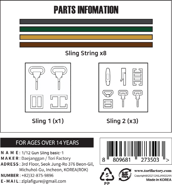1/12スケールのライフルや小銃のガンスリング(負い紐)を実物同様に再現できるガンアクセサリーセットです。スリングは小銃を持って移動する際の疲労の軽減や戦闘中の取り回しを容易にするなど重要な役割を担っています。そのスリングをブラック1では2種類用意しました。スリング1は一般的に普及しているシングルスリング、スリング2は現在の軍隊では定番と言えるCQCスリングとなっています。金具を3Dプリンターで出力しスリングベルトは折り目の模様まで表現した紙で再現しました。これを組立てる事で実物同様のスリングが完成します。各模型メーカーがキット化した1/12スケールの小火器に対応できるのでお気に入りのアサルトライフルに取り付けて1/12スケールのガンスリングガールに携帯させて下さい。接着には瞬間接着剤をご利用下さい。セットには瞬間接着剤は含まれません。