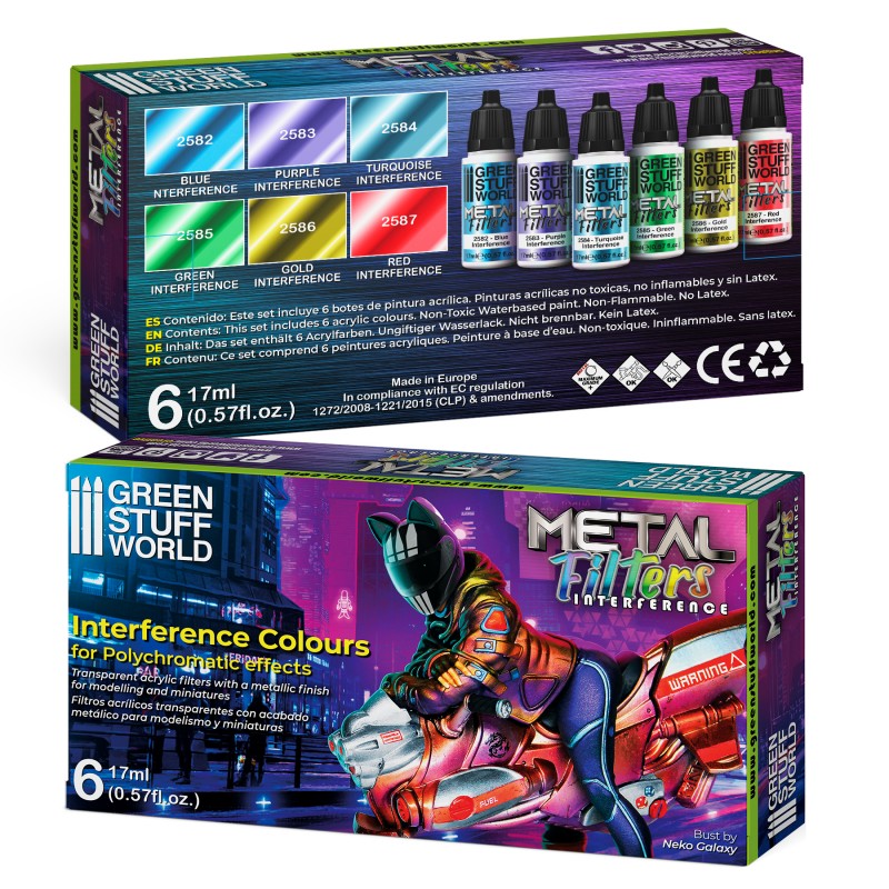 インターフィアレスカラーとは干渉色と言う意味で、二つ以上の彩色が角度や光量の違いで色合いが変化する効果をさします。良く似た効果のオーロラカラーは銀などの透過しない金属色を必ず下地にして偏色しますがインターフィアレスカラーは透明色で下地の色を活かしながら偏色する効果を発揮します。シャボン玉や油膜の表面に発生するメタリカルな波紋を連想して頂くと御理解頂けるかと思います。この下地色を活かしながら表面にメタリカルな偏色を効果的に行えるインターフィアレスカラーを6色セットにしました。インターフィアレスカラー同士は重ね塗りや混色が可能で下地にした色によっても発色が多彩に変化します。このセットなら様々な色調を一度に用意できるのでスターターセットとして最適です。塗装方法としては筆塗り、エアブラシ塗装の両方に対応出来ます。