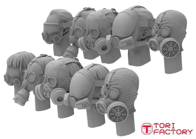 高品質レジン製 ガスマスク5種類に短髪、長髪それぞれ各1個 計10個入り ※本製品は未組立未塗装です。