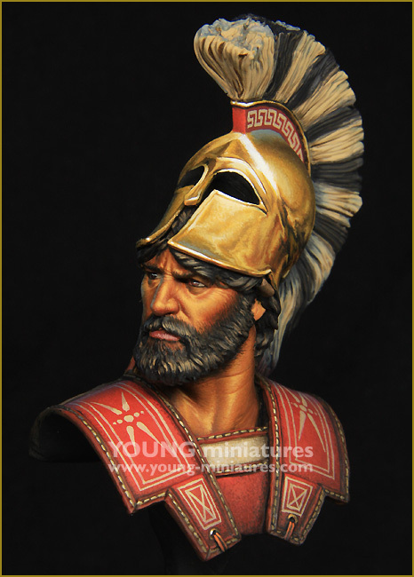 重装歩兵とは紀元前4世紀頃の古代ギリシャで生まれた兵種で鎧兜や肩当て、盾と言った重装の防具と槍や刀で武装した歩兵です。集団行動を行う事から一般兵より訓練期間が長く戦闘に長けていたと言われていた古代ギリシャ重装歩兵を1/10スケールの胸像で再現しました。古代ギリシャの重装歩兵の象徴とも言えるコリュス式兜に革と銅を組合せた美しい装飾の肩当まで質感たっぷりに再現した素晴らしいモデルです。