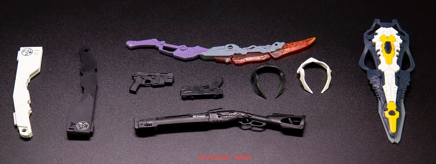 キットには1/12アーリア本体と同スケールのロボット犬とバイク、銃などの武器が付属し、シールドはバイクに接続が可能です。3種類の塗装済み顔パーツと無塗装の顔パーツが3個付属し、瞳デカールも付いています。素体の一部(脚やボディアーマーの一部)は白か黒のパーツを選択して組み立てることができます。素材:PVC&ABS&TPE