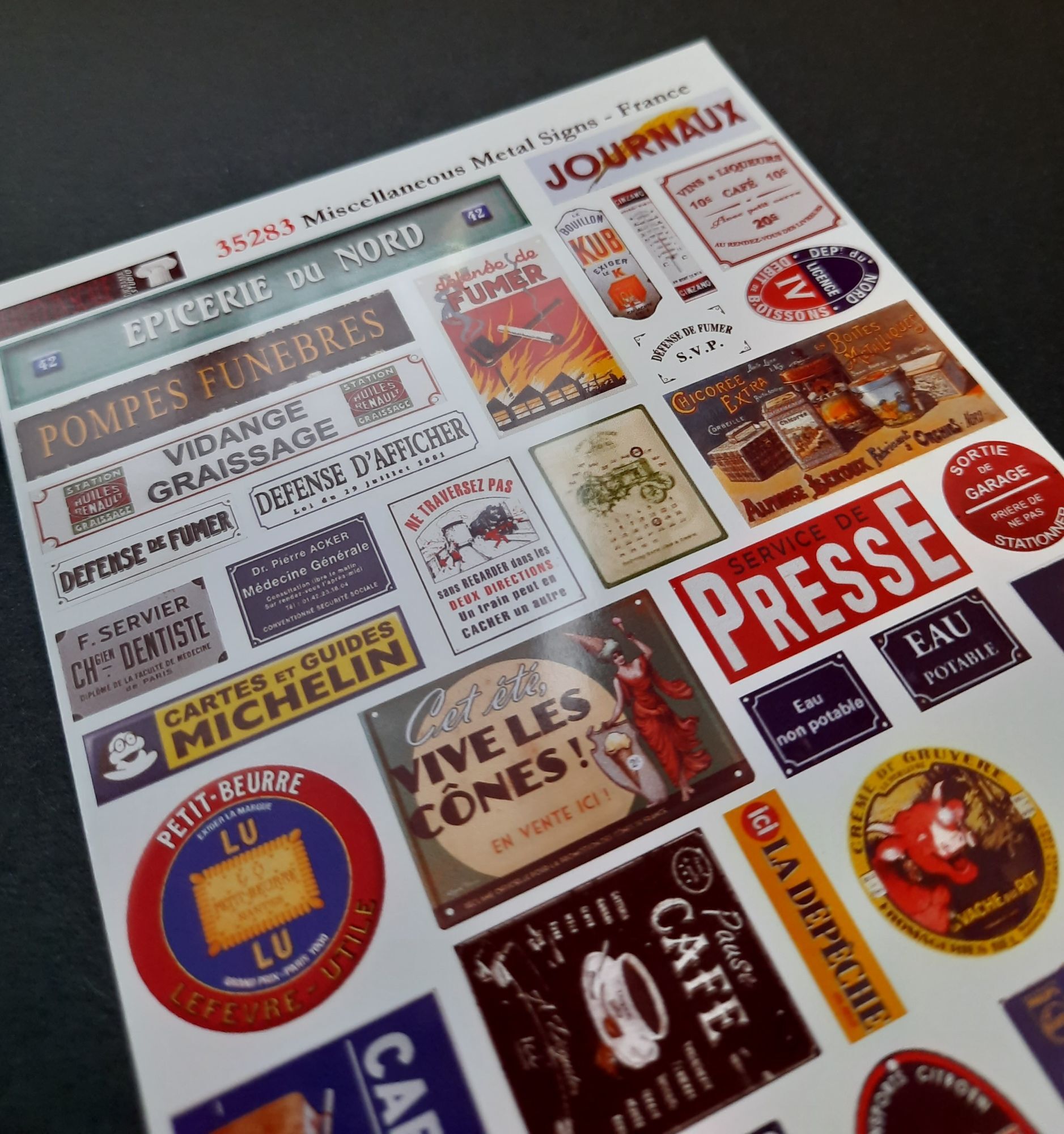 フランスの乳製品やコーヒー等の商品や商標の表した金属看板を高品質写真用紙に1/35スケールに見合うサイズで印刷したジオラマ用素材セットです。紙製ですが高品質印刷により金属板のような仕上がりとなっています。シートから切り出してご使用下さい。サイズ:10cm×14cm