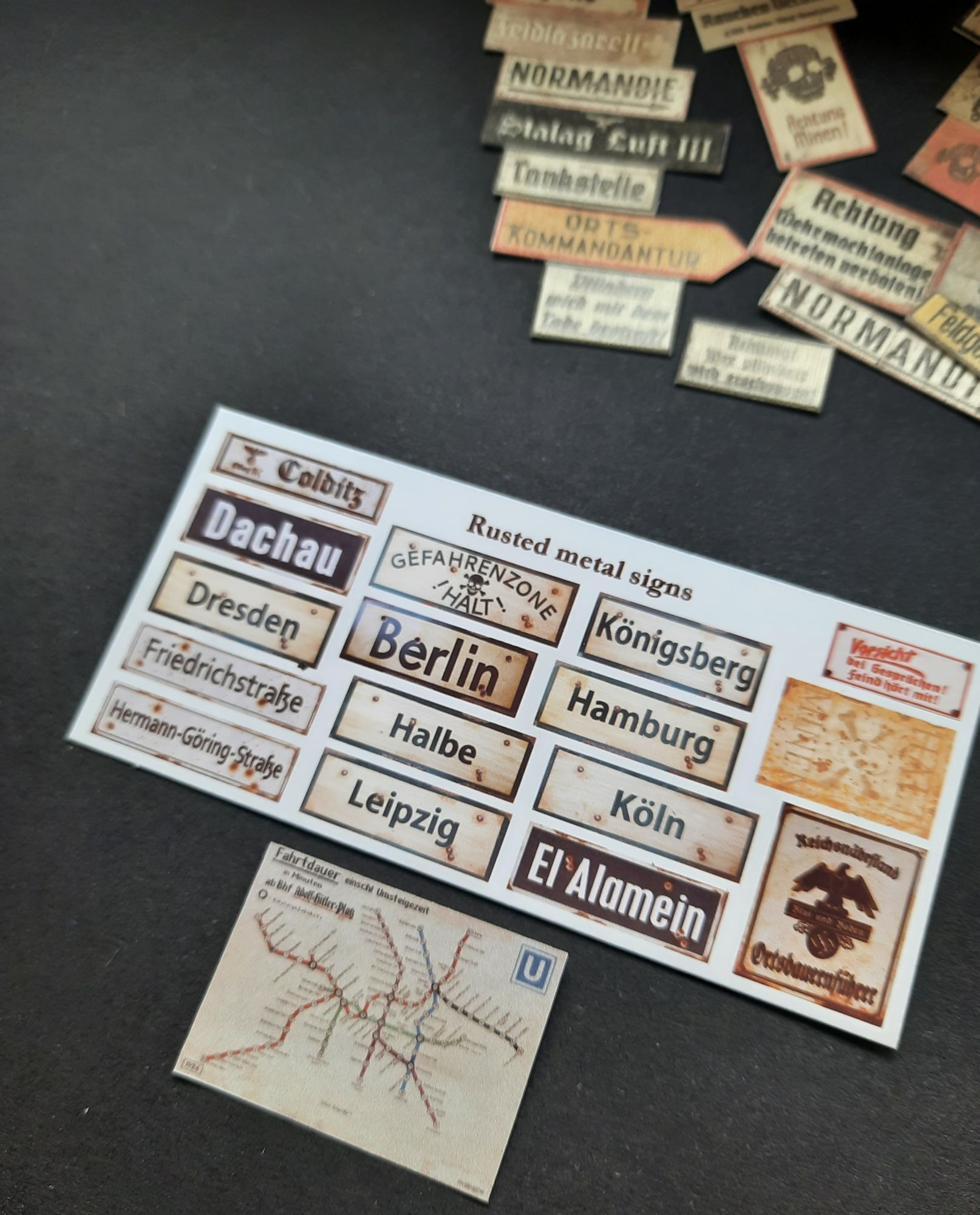 第二次世界大戦中のドイツ国内で掲げられていた戦時標語ポスター等を高品位印刷した上質紙と地雷原警告看板や軍令部を示す案内板を印刷した厚さ0.6ミリの薄い木板とを組合せた1/35スケールのジオラマ用素材セットです。