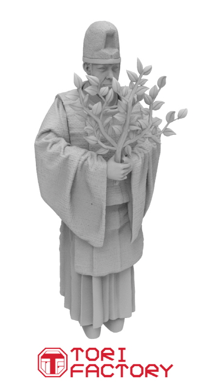 神事として御祈祷を行う神主を1/24スケールで再現したフィギュアセットです。神社で願い事やお祓いを受ける際に神への御名を唱える為に神主が祝詞(のりと)を奏上しますがそのシーンを再現したセットです。付属する祭壇には御供え物もしっかりとキット化しました。烏帽子(えぼし)は2種類、手に持つ神具は笏(しゃく)、榊(さかき)、祝詞(のりと)のいずれかを選択して頂けます。神主が1/24スケールなので交通安全を祈願するシーンを同じ1/24スケールの自動車モデルを使って再現するのも少し視点が変わって面白いでしょう。日本の八百万の神々を等しく信仰する原風景が製作できる製品です。別途[MF-26B]1/24 玉串を奉る神主と組み合わせて頂ければ修祓式を再現できます。
