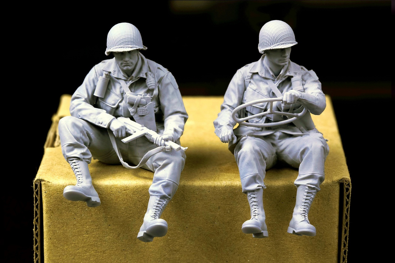 に乗っている姿を1/35スケールで再現したフィギュアセットです。トンプソン短機関銃を持つ助手席側隊員