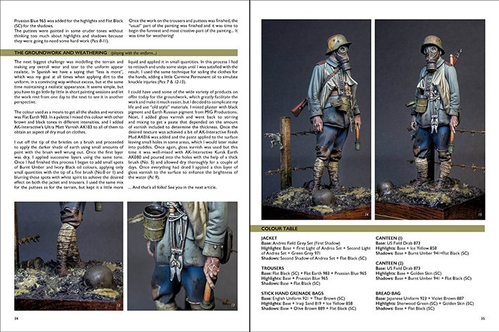 Christos Katselos is a regular contributor and returns with three articles covering a total of eight pages in the book. The first is fantasy - Amaryne, the border protector where Christos explains how to paint a large-scale female bust using a wet palette of acrylics paints over four pages. The second two-page article is “Sea Wolf”, a WWII German U-Boat Commander bust where he uses acrylics. The final two-page article is “War Daddy”, a WWII US Tank Commander. This figure is based on the movie character played by Brad Pitt and has been painted using acrylics.