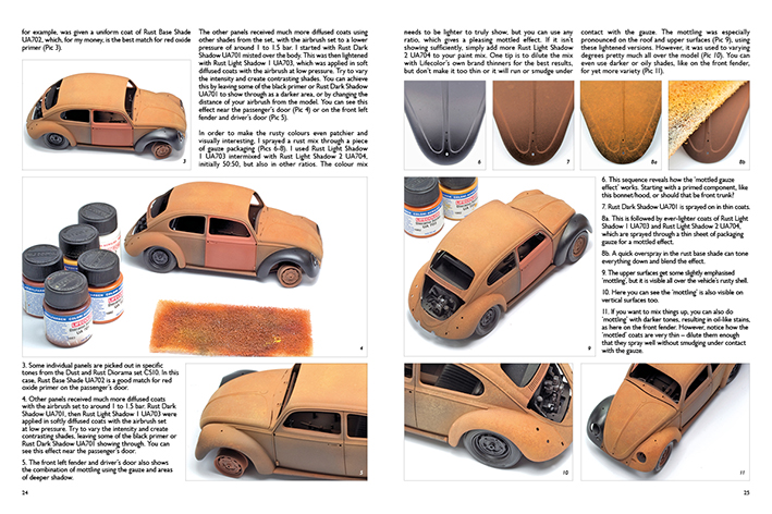 Martin Hughes is a well known Master and owner of the “Scale War Machines” YouTube channel who wrote our 6th article (Part 2), which concludes the chapter about weathering civilian vehicles. Martin explains in detail how to create Rust, Mould and Decay on a 1/24 scale Volkswagen Beetle. This is the second of a two-part feature; the first part was published in Volume 1. The eight-page article has 20 in-progress photos showing how to get the most of a ‘Rat-look’ on modern civilian cars making extensive use of the airbrush and Lifecolor products.