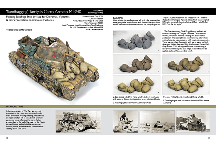 Talented artist Theodosis Giannakidis has contributed two unique articles to this volume on the secrets of achieving a natural and realistic finish. The first one is on ‘How to Paint Sandbags’ from Black Dog and the second is on ‘How to Paint Wood’ effects on Miniart’s Farm Cart. Both articles have step-by-step photos and detailed captions.