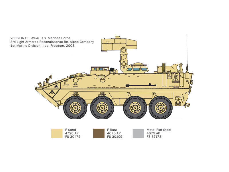 1980年代前半からアメリカ海兵隊などで使用されている水陸両用能力を持つ8輪駆動の装甲車「LAV-25」の中でも、TOW対戦車ミサイル2連装ランチャーを搭載した「LAV-AT」を1/35スケールでモデル化した組み立てキット。