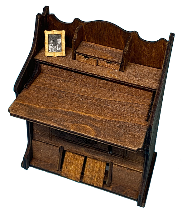 アメリカの古いオルガンを小さな机に修復したという設定のミニチュアモデルです。オルガンの雰囲気を残しつつ、かわいい机にしあがりました。