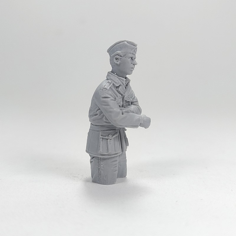 熱帯野戦服を着た独戦車兵を1/35スケールでキット化したフィギュアです。熱帯地域向けの野戦服と聞くと北アフリカ戦線に投入されたドイツアフリカ軍団(DAK)を連想しますが、実はこの熱帯野線服は地中海等の戦闘を想定した軍服で実際イタリア戦線で着用している例が有ります。また北ヨーロッパでも夏服として使用しておりその為このフィギュアは戦線地域の範囲がかなり広く取れると言えます。戦車に乗せるのを前提としているので上半身のみとなっています。レジン製 ※本製品は未組立未塗装です。