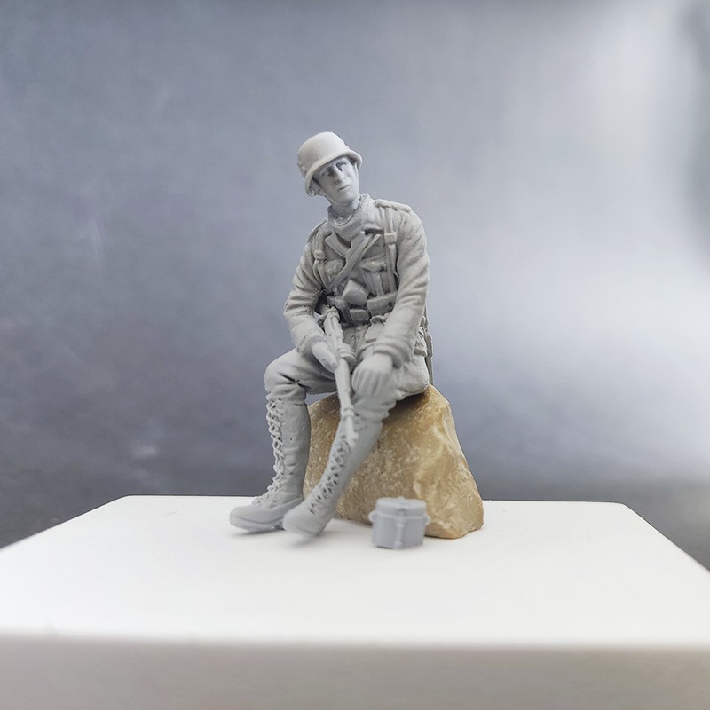 1942年より北アフリカに派兵され兵の数や装備で圧倒していたイギリス軍を様々な戦略で対等以上に戦ったドイツアフリカ軍団(DAK)の歩兵を1/35スケールでキット化したフィギュアです。戦闘準備を整え腰掛けて作戦開始を待つ姿を再現しており手に持っているKar98k小銃も精密に表現されています。熱帯野戦服のシワや、ベルト等の装備品、トロピカルブーツの靴紐のディテールが繊細なモールドで再現された素晴らしい造りのフィギュアです。レジン製 ※本製品は未組立未塗装です。