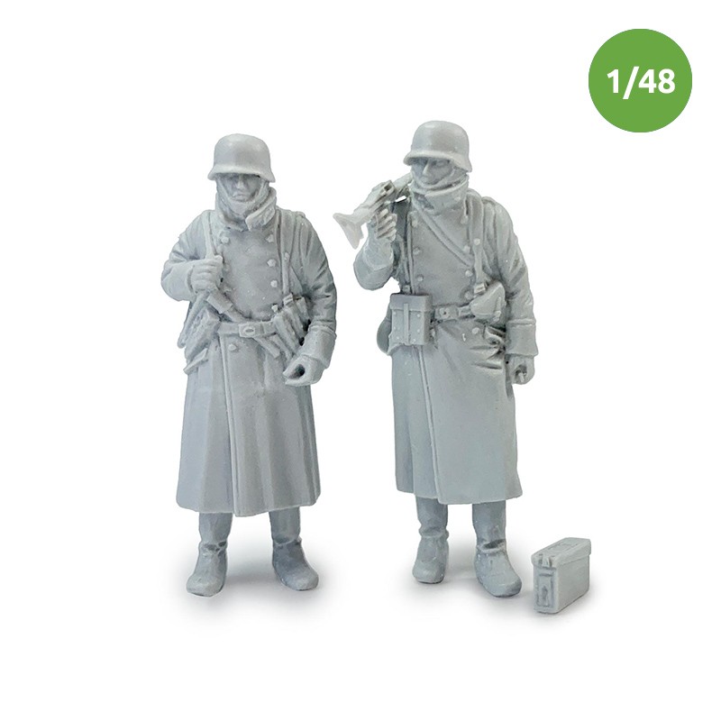 第二次世界大戦で冬季装備のMG42射撃手とその助手を務める独歩兵2体を1/48スケールでキット化したフィギュアセットです。オーバーコートを着た冬季装備の独歩兵をMG42などの小火器と、身に付けた装備品も含め精密なモールドで再現しています。弾薬箱もレジン成形だから可能なディテール付けを行っており1/48スケールとは思えない造りとなっております。厳冬期ながら激しい戦いとなった東部戦線の独兵士として同スケールの車両を交えたジオラマ造りに最適なセットです。レジン製 ※本製品は未組立未塗装です