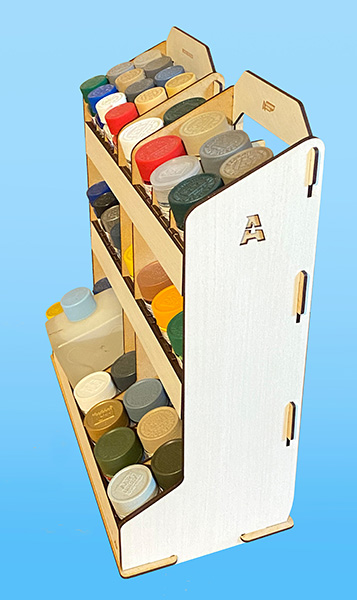 あらゆる塗料ボトルをたくさん収納可能です。差し込み移動式のパーテーションでスペースを変更することにより、きれいに整頓して収納できます。同シリーズのツールと並べて配置したり、重ねる機能もあります。キットはMDFと木目調MDFで構成され、見た目もよく重量で変形することを抑えた設計になっています。組み立てには工具と瞬間接着剤、木工ボンド、タッチアップ修正用塗料などが別に必要です。