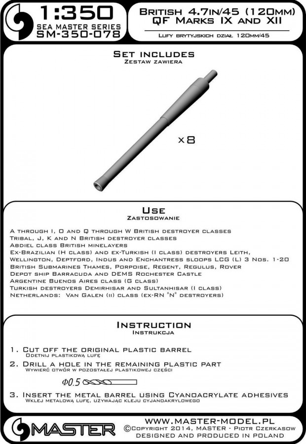MASTER[SM-350-078]British 4.7"/45 (120mm) QF Marks IX and XII (8pcs) ? British destroyer classes - A through N, O, Q through W and Tribal [ご注文締切日 2月6日(金)4月入荷予定]