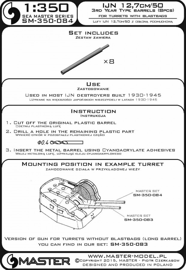MASTER[SM-350-084]IJN 12,7cm/50 (5in) 3rd Year Type barrels - for turrets with blastbags (8pcs) - most IJN destroyers built 1930-1945