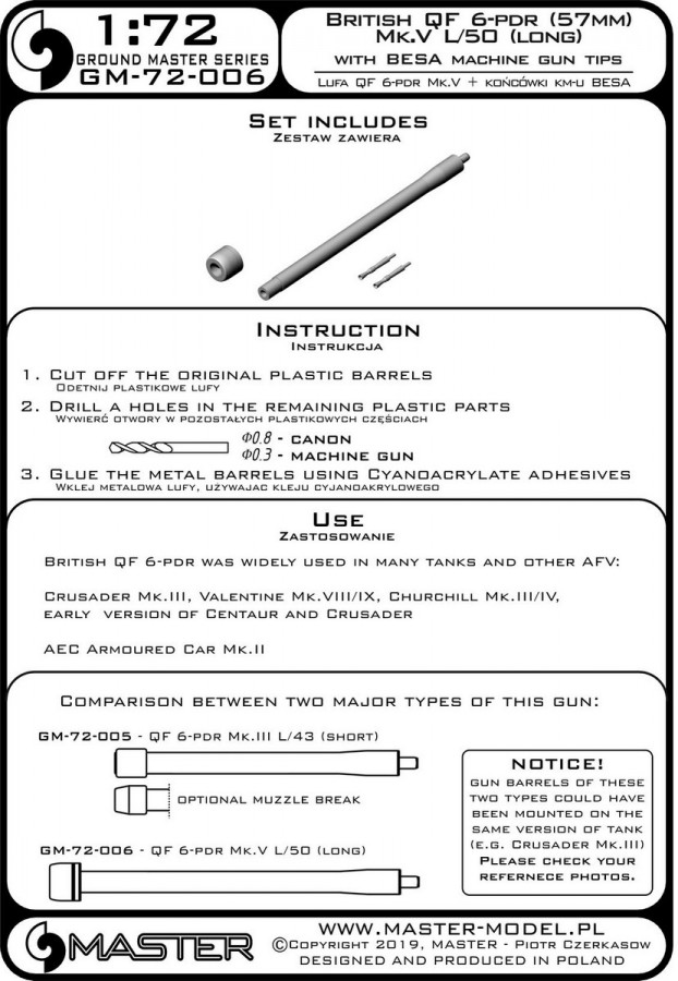 MASTER[GM-72-006]British QF 6-pdr (57mm) - version Mk.V L/50 (long) + Besa MG tips - for Crusader Mk.III, Churchill Mk.III/IV, Valentine Mk.VIII/IX