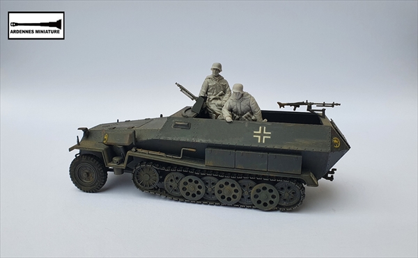 装甲車輌などに右手を突いて前方を見る武装親衛隊の兵士を再現します。ヘルメットを被り、フードの付いたM42防寒服を着用しています。