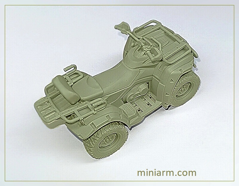 現用ロシア軍が2016年から導入を進めている軍用ATV(全地形対応車) AM-1を再現するフルキットです。全長約7.3cm程度の小型キットですが、ユニークなフォルムはもちろん、ハンドルや前後のラックなどの細部を正確に再現します。タイヤの複雑なトレッドパターンも精密にモールドしています。
