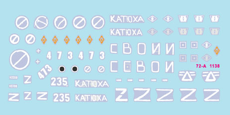 2022年のウクライナ侵攻でロシア軍が運用しているT-72B(Mod.1989)およびT-72BA主力戦車のマーキングを収録します。T-72B(Mod.1989)とT-72BAが各1種類、計2種類の塗装例をセットしています。