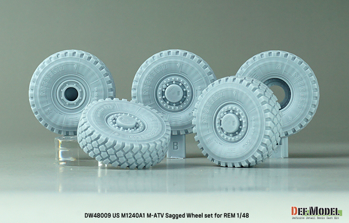 2009年からアメリカ軍で運用中のMRAP(重防御機動装甲車)M1240A1 M-ATV用のレジン製自重変形タイヤセットです。前後輪4個、スペアタイヤ1個をセットします。タイヤはミシュラン16.00-R20を正確にモデル化し、自重変形も再現されています。